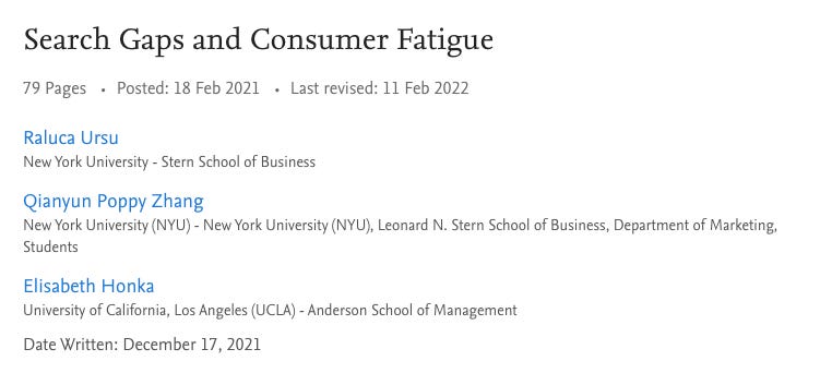 No artigo "Search Gaps and Consumer Fatigue" escrito por Raluca M. Ursu e Qianyun Zhang, da Universidade de Nova York, e Elisabeth Honka, da UCLA Anderson, os autores falam sobre o paradoxo da escolha como uma fadiga, principalmente no contexto de compras online. Essa fadiga se dá como um desgaste cognitivo: à medida que vamos avaliando mais opções, páginas e sites, o esforço mental para continuar buscando aumenta, transformando a busca por um simples óleo de cabelo em um alto custo de energia e atenção.